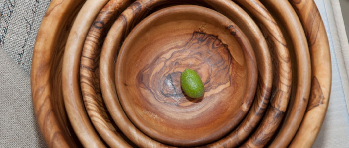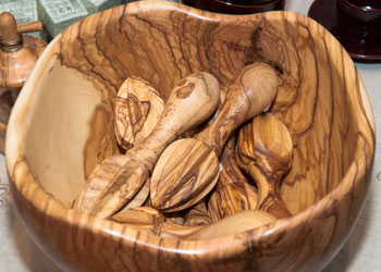 In La Bastide konnten Sie nicht nur Olivenöl verkosten, sondern auch die vielen praktischen Objekte aus Olivenholz erwerben, die Guillaume Dubosq erarbeitet: Olivenholzschüssel, Salatbesteck, Zitronenpresse...